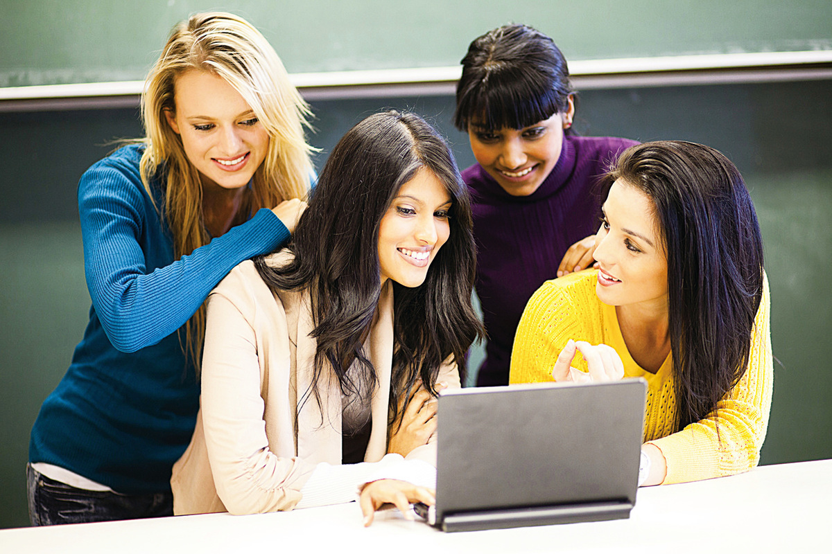 college students discussing project on laptop